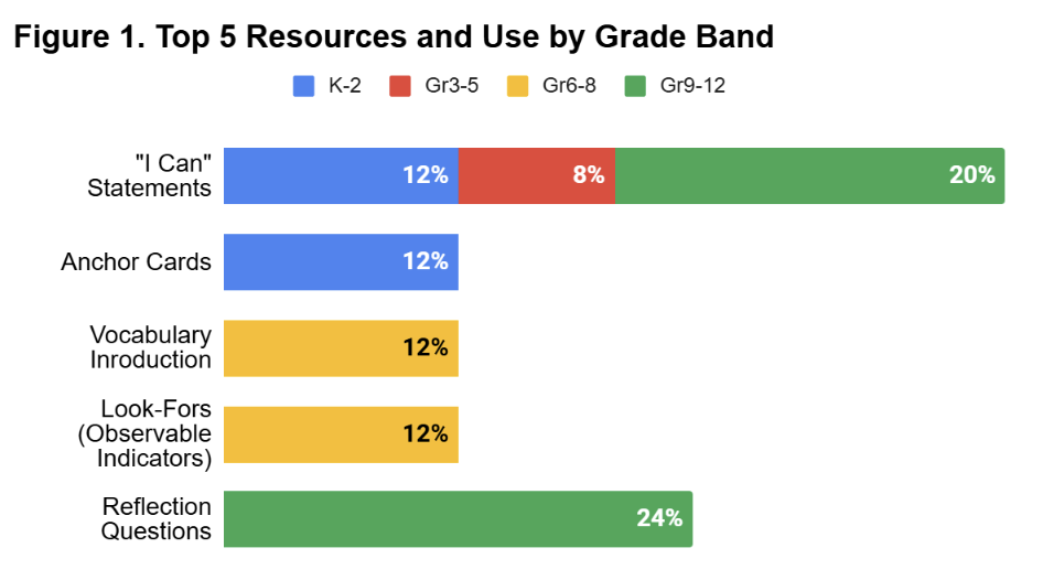 So far, educators have given us feedback on 25 different resources. Across all grade bands, “I Can” Statements have emerged as the most frequently implemented resource, with educators appreciating how they empower student ownership of learning (Figure 1). One high school educator noted that students “liked being able to pick one to work on” and that the statements “opened up communication about previous learning and what they wanted to focus on.”
