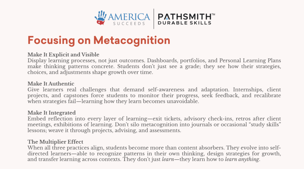Most powerfully, metacognitive students become authors of their own education. As Lauren discovered, understanding “I’m not a very detail oriented person” isn’t limitation but liberation. As Zoe learned, recognizing differences between group and self-motivation allowed her to create needed structure. When schools develop metacognition through making it visible, creating authentic contexts, and integrating reflection, they develop young people capable of continuous evolution—prepared not just for next year’s class but for lifetimes of growth.